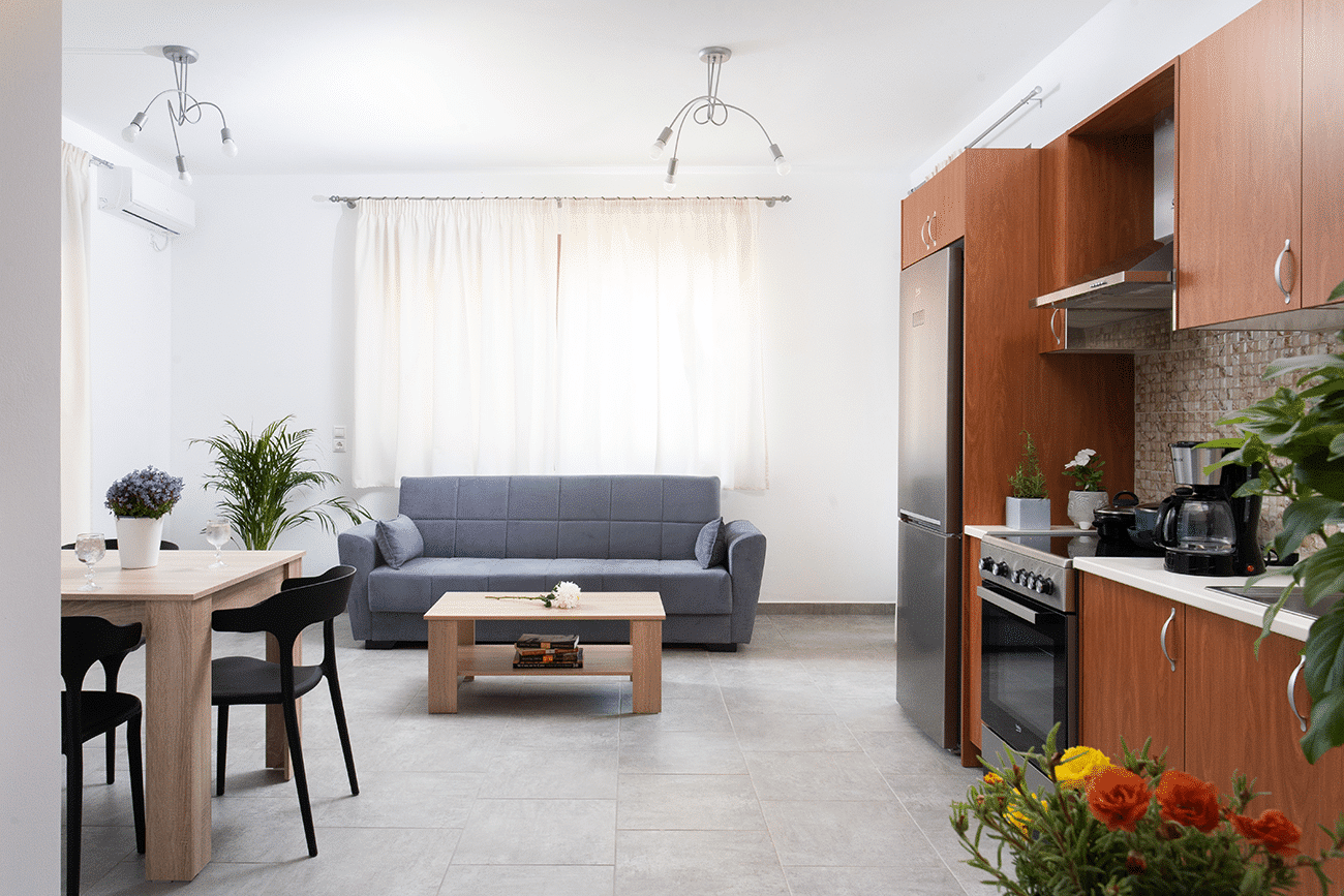 This spacious and air-conditioned apartment offers a private balcony with views of the, mountain and Aegean Sea.